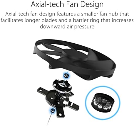 - Axial-tech Fan Design — A compact hub and barrier ring concentrate airflow for higher static pressure and quieter operation compared to standard fan designs.