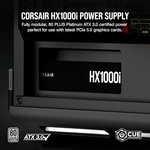 The Corsair HX1000i 1000W 80 Plus Platinum Fully Modular ATX Power Supply combines ATX 3.0 and PCIe 5.0 compliance with Platinum-grade efficiency for the most power-demanding builds. A 140mm fluid dynamic bearing fan runs in zero-RPM mode at low to medium loads for near-silent operation, while CORSAIR iCUE software enables custom fan curves, real-time power monitoring, and on-the-fly switching between single and multi-rail OCP protection. Designed for high-end Intel Core Ultra and AMD Ryzen 9000 platforms paired with RTX 5090 / Radeon RX 9070 XT class graphics cards.