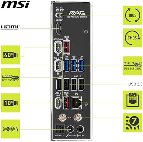 - USB 20Gbps Type-C & HDMI 2.1 — Rear IO includes a 20Gbps Type-C port, HDMI 2.1 video output, and 7.1-channel Audio Boost 5 with S/PDIF support.